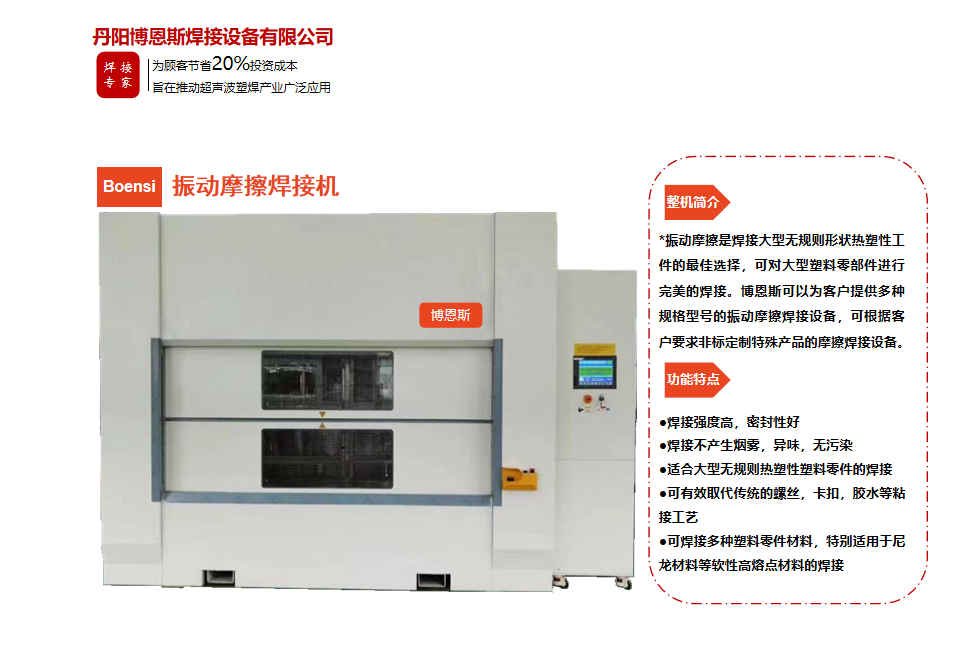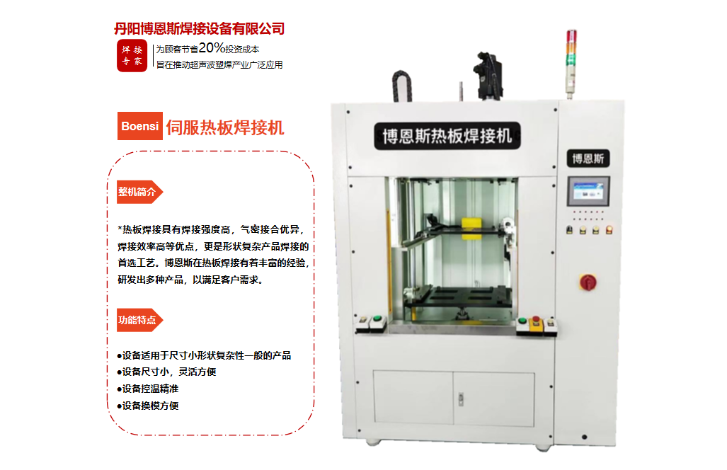 丹陽博恩斯焊接設備有限公司是塑料焊接領域集研發(fā)設計、生產制造、銷售服務為一體的企業。公司自成立以來堅持“以人為本”的理念,組織了一支強大的技術研發(fā)團隊,攜多年來積累的豐富經驗,并結合國際先進塑料焊接技術,根據市場需要,不斷開發(fā)具有核心競爭力的新產品。公司具有很強的非標機械研發(fā)、設計、生產能力,可為廣大客戶定制各類專用機械設備。公司設計生產的塑料焊接設備已廣泛應用于汽車、電子、家電、醫療器械、無紡布...
